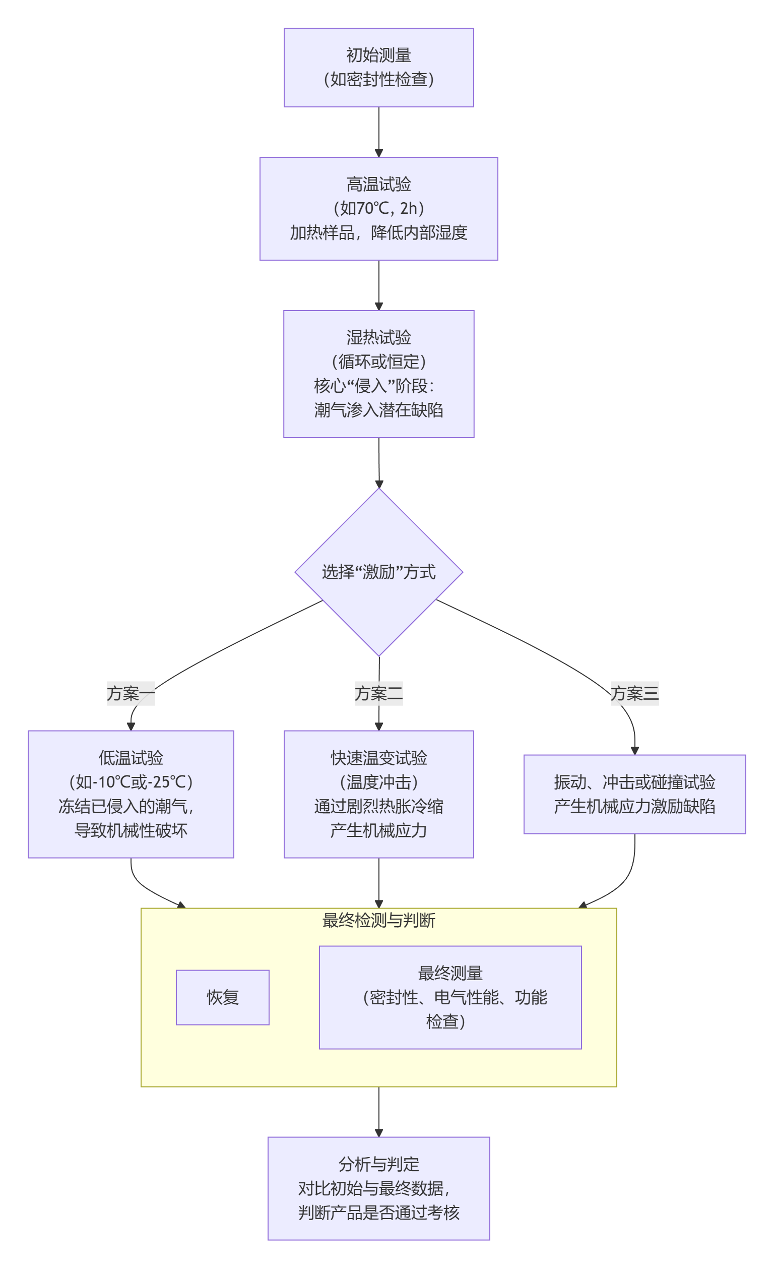 激勵 (Stimulation):然后施加一種極端的機械或氣候應(yīng)力(如低溫、溫度沖擊或振動),來“激勵”或“激活”這些缺陷。這個應(yīng)力會使已侵入的潮氣產(chǎn)生物理或化學(xué)作用(如結(jié)冰膨脹、加速腐蝕),或者使缺陷擴大變得可檢測。 3.