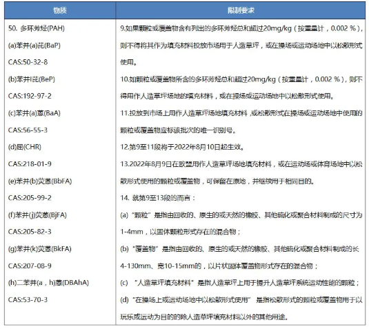 2021年7月21日,歐盟在其官方公報(bào)發(fā)布新法規(guī)(EU) 2021/1199,修訂歐盟REACH法規(guī)((EC) No 1907/2006)附件XVII第50條目,新增在人造草坪、操場或運(yùn)動(dòng)場地中用作填充物的顆粒或覆蓋物中多環(huán)芳烴(PAHs)的限制。該新法規(guī)將于歐盟官方公報(bào)發(fā)布后第20天生效。
